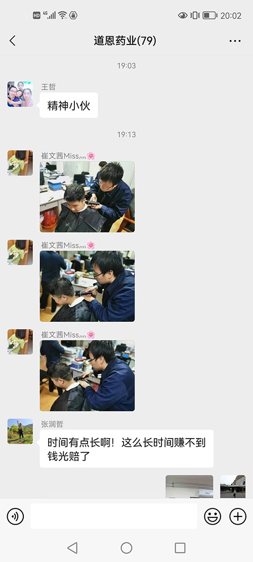 這兩天道恩藥業工作群里被一段段理發的視頻和搞笑的評論刷屏了。視頻里的“理發師”是道恩藥業生產總監王學智,他拿著電動推子全神貫注為員工理發,每一下都十分認真,不放過任何一個細節;被理發的“頹廢少年”秒變“精神小伙”;圍觀群眾打趣到:“服務這么長時間卻賺不到錢,光賠了。”理發現場的氣氛十分融洽,隔著屏幕都能讓我們感受到那份歡快。